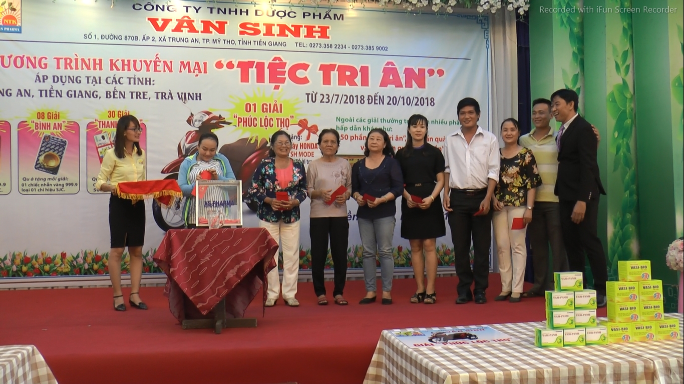 CÔNG TY TNHH DƯỢC PHẨM VÂN SINH xin chân thành cảm ơn sự quan tâm và ủng hộ của quý khách hàng trong thời gian qua. Nhằm đáp lại tấm chân tình của quí khách hàng, nay Công ty xin gửi đến quý khách hàng chương trình khuyến mại “TIỆC TRI ÂN” với nội dung như sau: I. THỂ LỆ CHƯƠNG TRÌNH - Khách hàng đăng ký, mua các sản phẩm trong “danh mục sản phẩm khuyến mại” theo hình thức “tích lũy doanh thu” tính từ 23/7/2018 đến hết 20/10/2018 với “tổng doanh thu” tích lũy được đủ 6.800.000 đồng (sáu triệu tám trăm nghìn đồng, đã bao gồm thuế VAT), với mỗi 6.800.000 đồng sẽ nhận được từ Công ty 01 phiếu “rút thăm may mắn” và một “thiệp mời” tham dự một buổi “tiệc tri ân” do Công ty tổ chức và chương trình rút thăm với nhiều phần quà hấp dẫn cũng được diễn ra ngay trong buổi tiệc ấy; - Công ty chỉ phát hành 150 phiếu “rút thăm may mắn” dành cho những khách hàng đặc biệt của chương trình này; - Công ty sẽ căn cứ vào “tổng doanh thu” mà khách hàng đã tích lũy trong thời gian khuyến mại để trao phiếu “rút thăm may mắn”. Khách hàng có được bao nhiêu phiếu “rút thăm may mắn” sẽ nhận được bấy nhiêu thiệp mời từ Công ty để tham dự chương trình rút thăm; - Cơ cấu giải thưởng chương trình rút thăm: